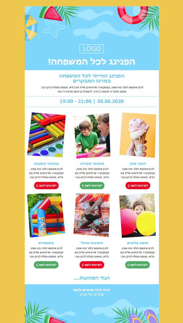 תבנית ניוזלטר מעוצבת בחינם לעדכון על ארועי הפנינג ופעילויות לכל המשפחה