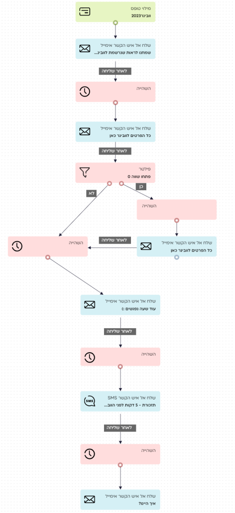 המסע מתחיל לאחר שנרשמו לוובינר באמצעות דף נחיתה > מייד ישלח מייל "שמחנו לראות שנרשמת לוובינר" > יום לפני הוובינר נשלח מייל תזכורת > מי שלא יפתח את המייל יקבל לאחר 5 שעות את אותו המייל פעם נוספת > שעה לפני האירוע נשלח מייל נוסף של תזכורת לכל הנרשמים > 5 דקות לפני נשלח SMS > וחצי שעה לאחר הוובינר נשלח סקר.